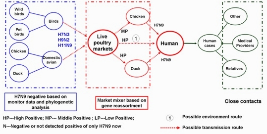 假說:“活禽交易市場”可能促使了人感染H7N9禽流感病毒的進化和產生。活禽市場,從生態學角度屬於人為的一個小生態環境,其中有家禽的交易、寵物鳥類的交易以及捕捉的野生鳥類的交易,為各種亞型的禽流感病毒在這個小生態環境中發生基因重組提供了機會。