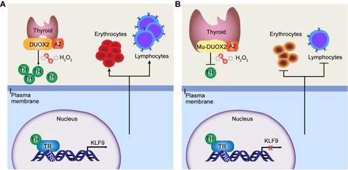 先天性甲狀腺激素功能低下症(甲減),是由甲狀腺激素分泌不足導致的最常見的內分泌紊亂之一。世界範圍內新生兒中發病率高達1:1,400-1:2,800。在臨床中,20-60%甲減患者表現貧血或者免疫缺陷等症狀,然而分子機製卻不明確。盡管甲狀腺激素替代是治療甲減患者的常用方法,然而相關報道表明對於一些嚴重的甲減且並發貧血的患者而言,通過服用甲狀腺激素並不能完全治愈,說明甲狀腺激素嚴重缺乏所帶來的損害並不是完全可逆的。