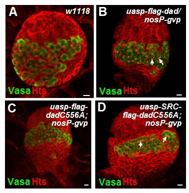 Gonads collected from 3rd instar larva of indicated genotypes were stained with anti-Vasa (Green) and anti-Hts (Red) antibodies.
