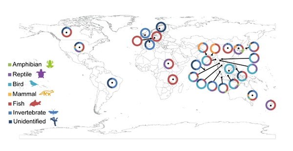 圖6. 全球動物放生事件空間分布及放生類群組成