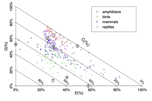 圖2. 270種陸生脊椎動物的進化潛力(G)、生態潛力(E)和拓殖潛力(C)評估的直角三元圖。其中數字表示的物種如下:(1)中華大鯢,(2)大熊貓,(3)中國小鯢(Hynobius chinensis),(4)朱鹮,(5)夏威夷葦鶯 (Acrocephalus familiaris),(6)非洲象(Loxodonta africana),(7)白頭海雕(Haliaeetus leucocephalus),(8)揚子鱷。
