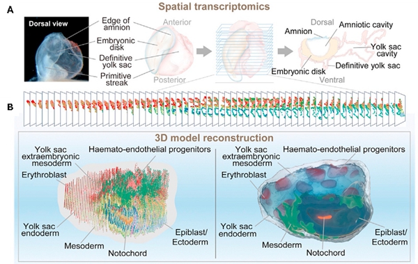 A:CS8胚胎結構與空間轉錄組測序過程;B:3D重構點雲圖與模式圖。