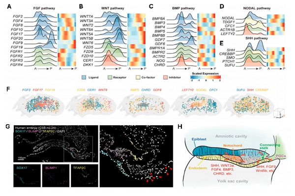A-E:通路配體、受體、抑製劑在A-P軸上的分布特征;F:部分配受體和抑製劑在胚胎空間上的分布;G:PGC在connecting stalk處的分布;H:notochord/connecting stalk及其信號在胚胎中的分布示意圖