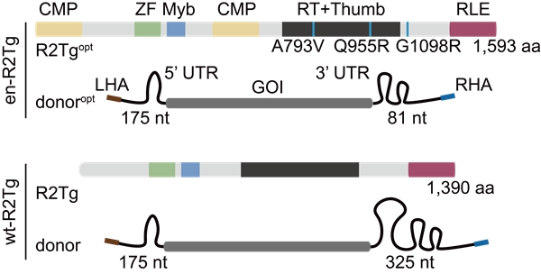 在本研究中,研究團隊首先通過數據挖掘,全麵係統地分析了自然界中R2逆轉座子元件的生物多樣性;通過構建基於RNA供體的基因寫入的報告體係,成功篩選出在哺乳動物細胞中具有完整GFP功能基因整合活性的R2Tg係統(來源於一種鳥Taeniopygia guttata 的基因組)。隨後,研究團隊針對R2Tg係統發揮功能所必需的兩個關鍵組分:R2蛋白質以及供體RNA,進行了係統性的功能探索與工程化改造,最終獲得了在人細胞係中基因整合效率超過20%的en-R2Tg工具(圖1)。