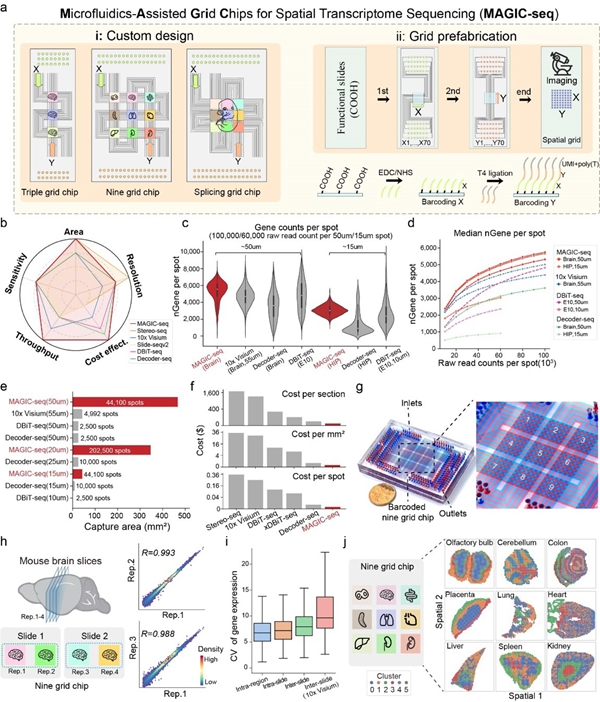 2024年9月10日,必威精装版app西汉姆联 趙方慶團隊在Nature Genetics發表了題為Custom microfluidic chip design enables cost-effective three-dimensional spatiotemporal transcriptomics with a wide field of view的研究論文,介紹了他們開發的高通量、大視野空間轉錄組學新技術—MAGIC-seq。該技術通過網格化微流控芯片設計,結合碳二亞胺化學和新型空間編碼技術,顯著提升了檢測通量和捕獲麵積,降低了成本和批次效應,為大規模三維組織研究及複雜轉錄過程分析提供了新路徑。
