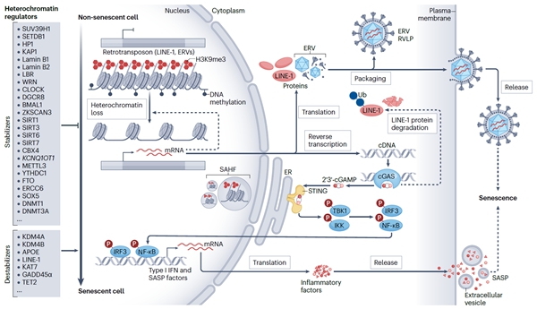 圖:異染色質丟失與轉座子激活在細胞衰老調控中的作用機製