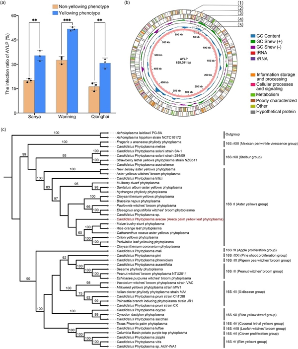 研究團隊首先通過在海南省三亞市、萬寧市和瓊海市通過走訪、調研和建立跟蹤觀察點的方式標記不同表型樹種進行病原檢測,確認了檳榔黃化植原體是檳榔黃化病的關鍵病原;通過二代測序和三代測序相結合的方法,首次拚接了檳榔黃化植原體基因組草圖,通過進化樹分析,檳榔黃化植原體為16S rⅠ型,圖1。