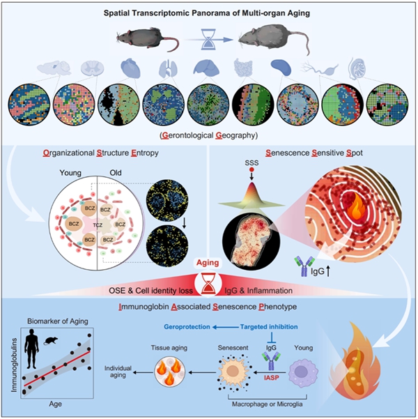 該研究首次繪製了哺乳動物多器官衰老的空間轉錄組地圖,揭示了組織結構紊亂和細胞身份丟失是衰老的關鍵特征,並精確定位了衰老敏感的核心區域。研究提出的免疫球蛋白相關衰老表型(Immunoglobin-associated Senescence Phenotype,簡稱IASP)不僅拓展了衰老科學的研究疆域,還為延緩衰老及防治相關疾病開辟了新路徑。