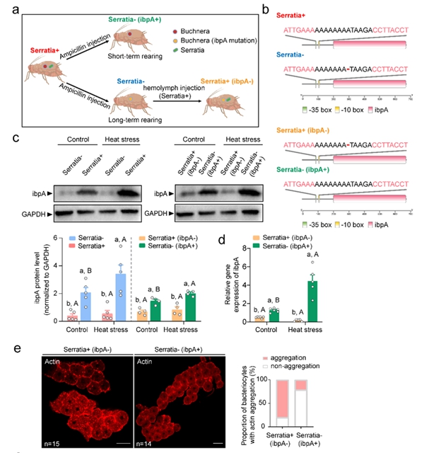 圖2. 蚜蟲共生菌Serratia通過降低熱激蛋白ibpA啟動子區單核苷酸突變,增強蚜蟲種群的高溫耐受力。