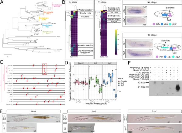 最後,通過係統比較Ilp1、Ilp2及Ilpr基因突變品係後,結果進一步證實了文昌魚Pdx蛋白並沒有直接調控Ilp1和Ilp2基因表達的能力。其中,Pdx表達僅限於成年文昌魚中腸的特定區域,而文昌魚Ilp1和Ilp2基因則不在這個區域表達。基因敲除實驗表明,Ilp1蛋白在控製幼魚身體生長方麵發揮類似脊椎動物胰島素樣生長因子的功能,而與脊椎動物胰島素不同,Ilp1和Ilp2基因表達水平對進食的反應較弱。此外,文昌魚Ilp1多肽能夠與文昌魚Igfbp蛋白產生微弱相互作用,與脊椎動物Igf1和Igfbp蛋白互作的典型特征相似。