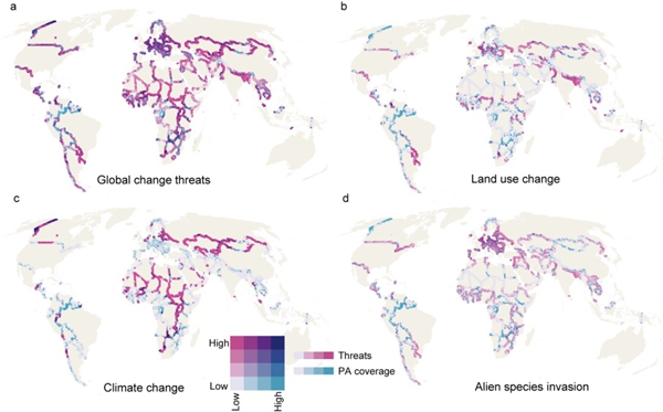 全球約三分之一陸地生物多樣性熱點區域以及60%的陸棲脊椎動物分布在跨境地帶,這些區域同時也麵臨生物入侵、氣候變化、生境幹擾等諸多全球變化挑戰。自然保護地是維係本土物種原生性和抵禦外來物種入侵的重要載體,但跨境地帶自然保護地對本土物種的保護有效性及其麵臨的外來物種入侵等全球變化風險從未開展過全麵評估,製約了跨境保護和風險管控策略的發展。