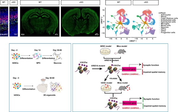 此外,研究組還首次揭示了染色質重塑SWI/SNF複合體組分ARID1A通過介導特定位點組蛋白修飾,調控海馬區神經幹/祖細胞向神經元譜係轉變的功能(Cell Death and Differentiation,2023)。ARID1A缺失會導致小鼠海馬突觸傳遞和樹突形態缺陷引起的認知障礙,以及人類興奮性神經元的樹突分支和電生理活動異常。值得注意的是,補充表觀遺傳代謝物乙酸鹽可以改善ARID1A缺失引起的形態學和電生理學缺陷,提示乙酸鹽可能成為Coffin-Siris綜合征(CSS)的潛在治療幹預措施(EMBO Molecular Medicine,2022)。