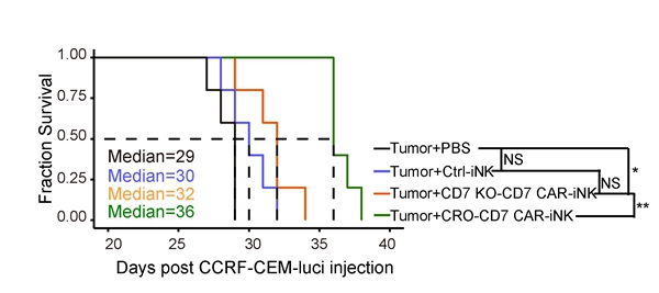 圖4 CRO-CD7 CAR-iNK細胞顯著延長T-ALL細胞荷瘤小鼠的生存期