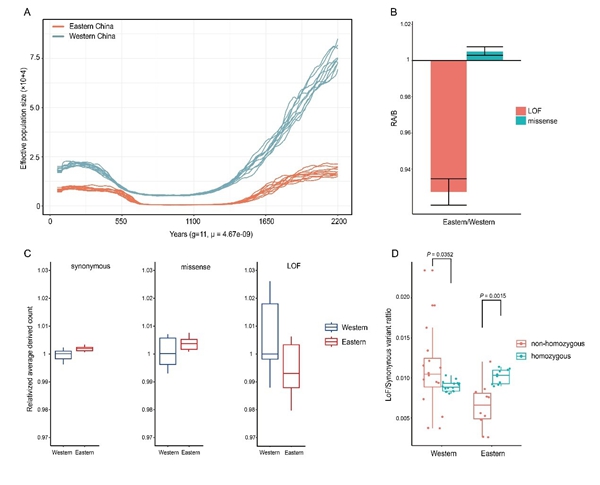 其次,通過對種群近期曆史動態的GONE分析發現,東西部種群在約1100年前經曆了劇烈的種群瓶頸期,且發現東部種群中高度有害突變較西部種群有所降低,但中等有害突變較高,從而推測東部群體可能主要受到了遺傳漂變和純化選擇共同作用的影響;盡管純化選擇可能降低高度有害突變位點的頻率,但部分中等有害突變位點會隨機漂變至高頻而導致純化選擇失效。因此,該研究認為中等有害突變位點的隨機固定會對未來氣候變化的適應性造成長期損害。