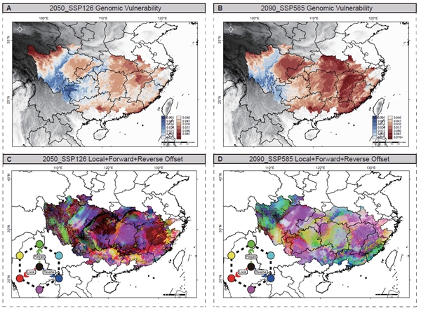 圖3 在2050年SSP 1-2.6情景和2090年SSP 5-8.5情景下,對未來氣候變化的遺傳偏移量預測