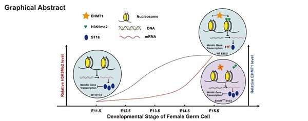 研究團隊發現,在雌性生殖細胞發育過程中,H3K9me2修飾的動態重建對減數分裂的順利進行至關重要。這一過程主要依賴於組蛋白甲基轉移酶EHMT1的表達上調,其介導的H3K9me2修飾可有效抑製轉錄抑製因子ST18的表達。在EHMT1缺失小鼠中,H3K9me2重建失敗導致ST18異常激活,進而抑製多個關鍵減數分裂基因(如Stra8、Sycp3、Dmc1等)的轉錄,最終引發減數分裂前期阻滯及生殖細胞凋亡。該研究揭示了H3K9me2(EHMT1)-ST18-Meiotic genes調控軸在減數分裂基因表達中的重要作用,為深入理解女性生殖細胞發育障礙的分子機製提供了新的研究方向,並為相關生殖疾病的臨床幹預策略提供了潛在靶點。