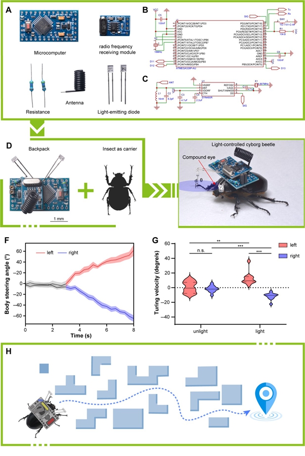 A:電子背包構成組件;B:控製芯片的最小係統原理圖;C:射頻模塊原理圖;D:組裝完成的電子背包及載體昆蟲;E:半機械昆蟲;F:轉向控製前後半機械昆蟲的體軸偏轉角度;G:轉向控製前後半機械昆蟲的轉向角速度;H:光引導半機械昆蟲的潛在應用示意圖。