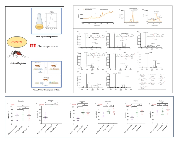 基於轉錄組分析,發現北京市白紋伊蚊野外種群的抗藥性與多個解毒酶基因的超量表達相關聯 (Zhou et al.,2024)。通過構建體外重組酶係,評估了細胞色素CYP9J26蛋白對六種常用殺蟲劑的代謝能力,並利用HPLC-MS/MS 技術對代謝產物的化學結構進行了解析。研究發現CYP9J26 能以底物依賴的催化反應機製代謝多種類型的殺蟲劑,包括雙硫磷、馬拉硫磷、殘殺威、氯菊酯和溴氰菊酯。利用GAL4/UAS 轉基因果蠅的生物測定結果顯示CYP9J26的超量表達顯著提升了果蠅對白紋伊蚊常用殺蟲劑的耐受性(Zhao et al.,2025)。該項研究在生物化學層麵揭示了CYP9J26對常用殺蟲劑的代謝活性與代謝途徑,用體內和體外實驗證據證明了CYP9J26在多種類型殺蟲劑抗性中發揮重要作用。