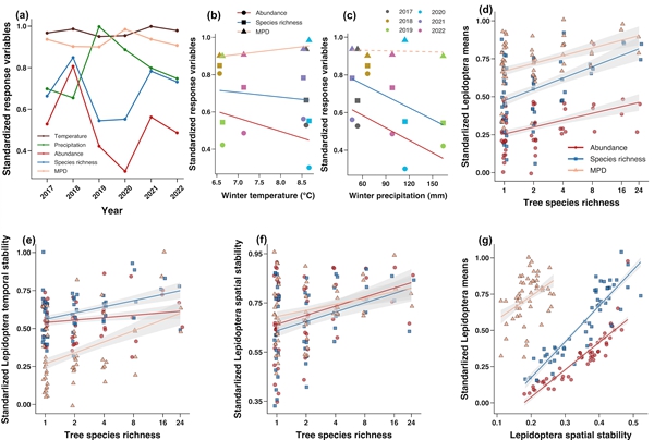 2. 樹種豐富度與鱗翅目幼蟲的平均多度、物種豐富度、MPD以及其時間和空間穩定性均呈正向關聯(圖2d–g)。