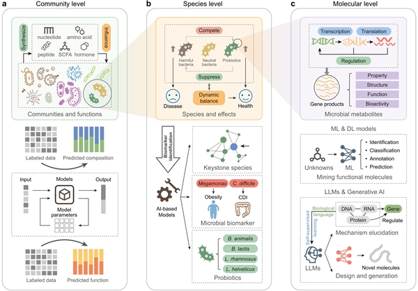 在微生物組研究中,理解微生物與宿主之間的關係,不能僅停留在單一層級。本文通過構建了一個清晰的多尺度建模框架,展示了AI技術如何在群落、物種和分子三個層級上協同發力,實現從宏觀生態到分子機製的係統解析(圖3)。