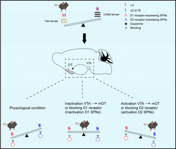 在自然環境中,動物常常需要依賴氣味來評估食物的營養價值。為了深入探索這一行為背後的神經基礎,研究團隊構建了一套模擬自然捕食的行為實驗係統,以棉鈴蟲幼蟲為研究對象展開實驗。令人驚訝的是,無論處於空腹還是飽腹狀態,小鼠都顯著傾向於捕食“已進食”的幼蟲,而這一行為高度依賴於其主嗅覺係統的完整功能。研究團隊運用氣相色譜-質譜聯用技術,從幼蟲體表揮發物中精準鑒定出兩種關鍵化學信號:在正常進食幼蟲體表含量較高的亞油酸(LA),以及在饑餓幼蟲體表顯著富集的(Z)-9-二十三碳烯[(Z)-9-TE]。行為學實驗進一步證實,LA對小鼠具有吸引作用,而(Z)-9-TE]則引發回避反應,且這兩種效應均呈現濃度依賴性。進一步研究發現,起源於腹側被蓋區(VTA)、投射至內側嗅結節(mOT)的多巴胺神經通路,是調控氣味偏好的核心樞紐。通過化學遺傳學技術精準調控該通路活性,研究人員成功實現了對小鼠行為選擇的雙向操控:抑製通路會削弱小鼠對LA的偏好,而激活通路則能讓小鼠轉而偏好原本回避的(Z)-9-TE。在細胞機製層麵,研究團隊借助光纖記錄技術發現,mOT區的D1型和D2型多棘投射神經元分別對LA和(Z)-9-TE表現出特異性反應。藥理學實驗證實,D1受體介導了對LA的趨近行為,而D2受體則參與了對(Z)-9-TE的回避反應,二者形成了一種精妙的“蹺蹺板”式平衡調控機製(圖1)。值得一提的是,LA和(Z)-9-TE誘發的表型在布氏田鼠和褐家鼠等野生齧齒類動物中同樣存在,提示此兩種化合物的生物學效應可能具有跨物種的保守性。