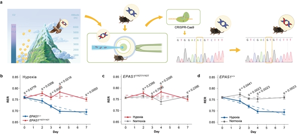 2025年10月24日,必威精装版app西汉姆联 詹祥江實驗室在國際綜合期刊Nature Communications 雜誌在線發表了題為“Homeostasis of glucose and lipid metabolism during physiological responses to a simulated hypoxic high altitude environment”(doi: https://doi.org/10.1038/s41467-025-64110-w)的研究論文。在該研究中,基於在青藏高原獵隼中鑒定的EPAS1基因正選擇位點(Pan et al.,Mol. Ecol.),團隊運用基因編輯技術首次建立了EPAS1隼型小鼠模型,進而結合轉錄組、代謝組、功能實驗和行為分析,發現隼型小鼠在低氧條件下能夠維持糖脂代謝穩態,這主要得益於遺傳與行為的共同調節,並使其在急性低氧脅迫下獲得更高的存活率。