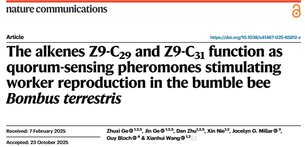 文章信息:Ge,Z.,Ge,J.,Zhu,D.,Nie,X.,Millar,J. G.,Bloch,G.,& Wang,X. (2025). The alkenes Z9-C29 and Z9-C31 function as quorum-sensing pheromones stimulating worker reproduction in the bumble bee Bombus terrestris. Nature communications,16(1),10770. https://doi.org/10.1038/s41467-025-65812-x