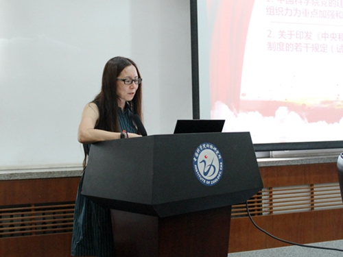 黨委委員、幹細胞與生殖生物學國家重點實驗室主任王紅梅同誌就學習《中央和國家機關嚴格黨的組織生活製度的若幹規定》和《中國科學院黨的建設工作領導小組關於以提升組織力為重點加強和改進研究所黨建工作的通知》進行主題發言。王紅梅詳細解讀了兩個政策文件,結合研究所黨建工作實際,提出了對如何全麵貫徹落實兩個文件的認識和看法。她指出,要嚴格黨的組織生活製度,以提升組織力為重點加強和改進研究所基層黨建工作,助力中國科學院率先實現科學技術跨越發展、率先建成國家創新人才高地、率先建成國家高水平科技智庫、率先建設國際一流科研機構。