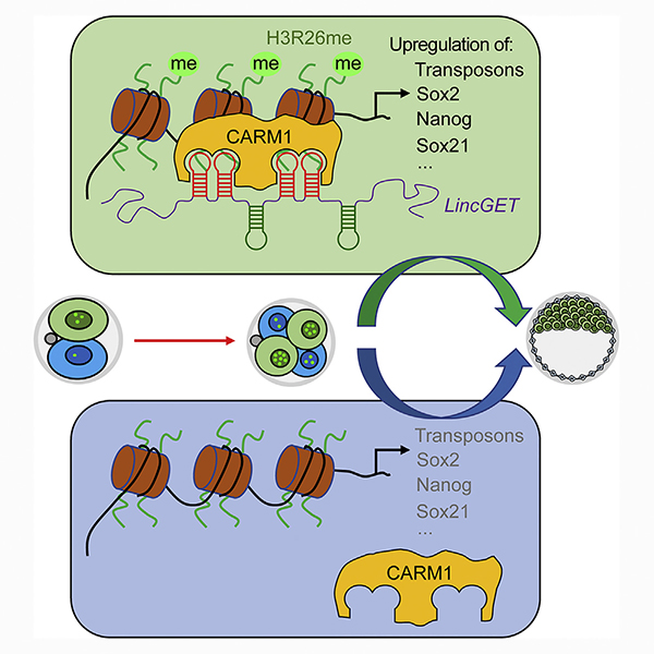 LincGET在2-細胞期的兩個卵裂球之間不均等表達,通過CARM1調控細胞命運選擇