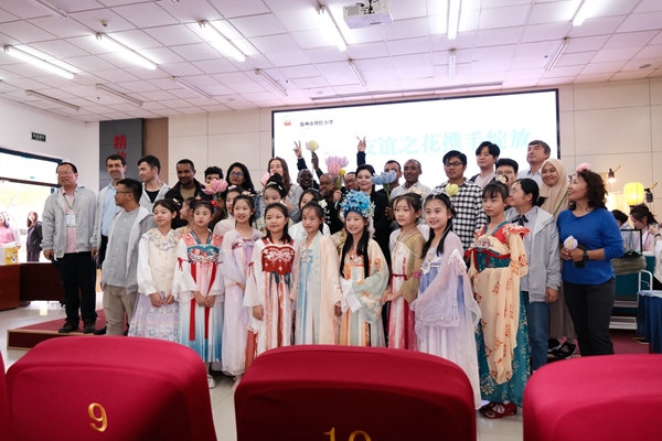 滄州市育紅小學展示非物質文化遺產絨花的製作;學員們每人製作一個荷花葉,並最終完成一個完整荷花,寓意文明互鑒與合作