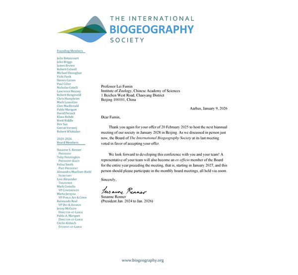 2026年1月9日收到TIBS主席的正式書麵通知,當天與會中國學者在奧胡斯召開了第一次籌備工作推進會,部署了重要節點性工作。期待國內生物地理學同仁積極支持和參與這一國際盛會,攜手推動我國及全球生物地理學領域發展。