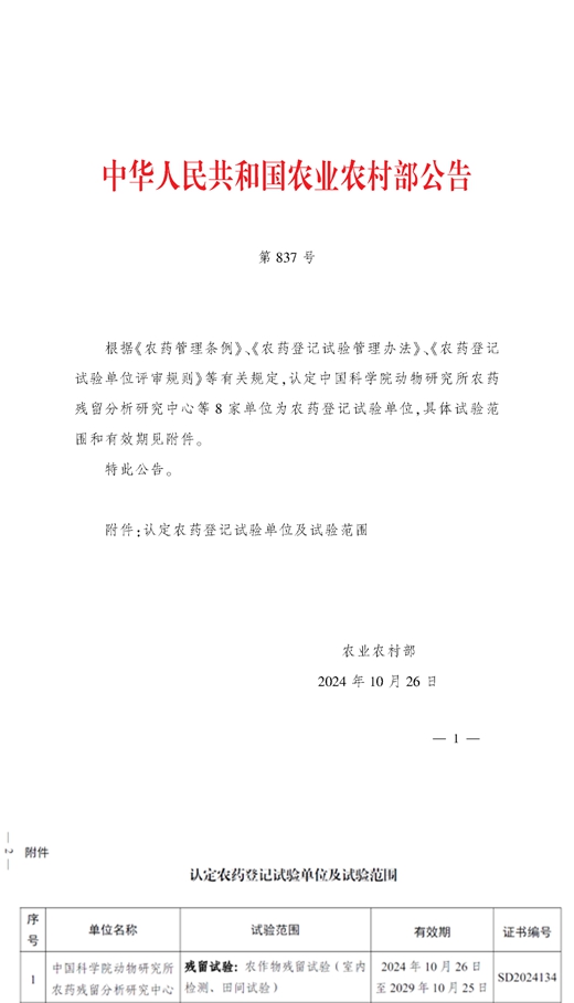 2024年10月26日中華人民共和國農業農村部第837號公告頒布,根據《農藥管理條例》、《農藥登記管理辦法》、《農藥登記試驗單位評審規則》等有關規定,經資料審查、現場檢查和綜合評審,認定必威精装版app西汉姆联 農藥殘留分析研究中心為農藥登記試驗單位,開展農作物殘留試驗(室內檢測、田間試驗),有效期五年。