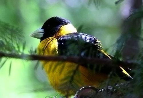 黃頸擬蠟嘴雀鮮豔的黃色在林中很容易被發現